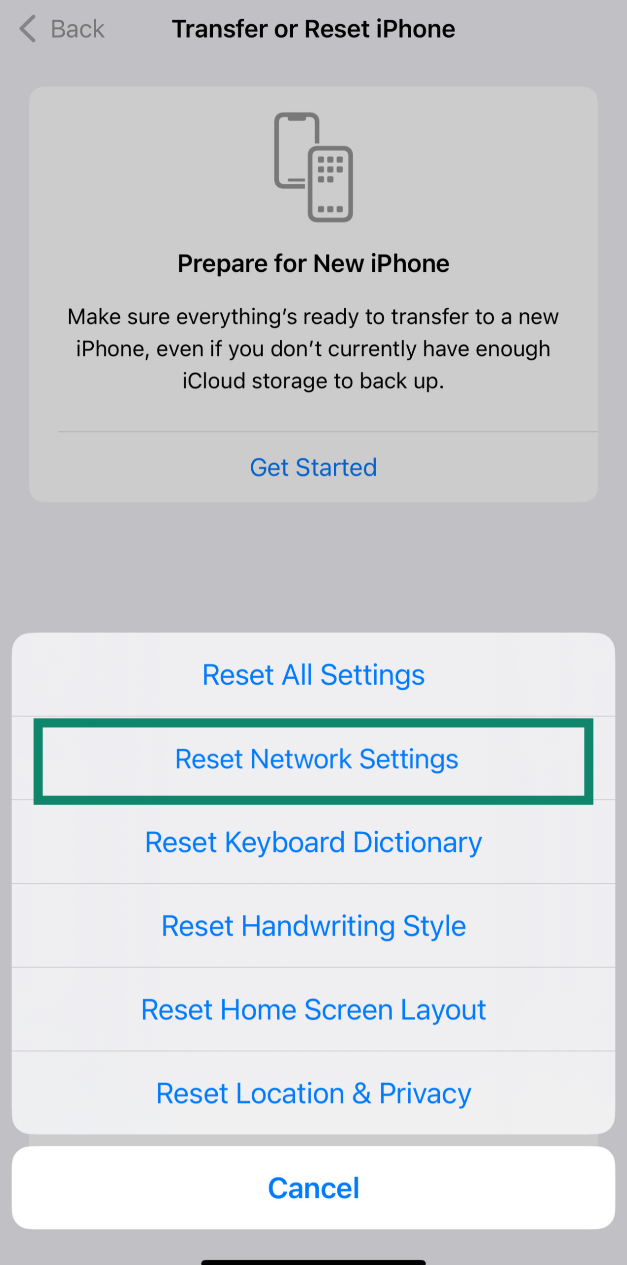 - Choose Reset Network Settings. Your iPhone will restart, and your network settings will be cleared.