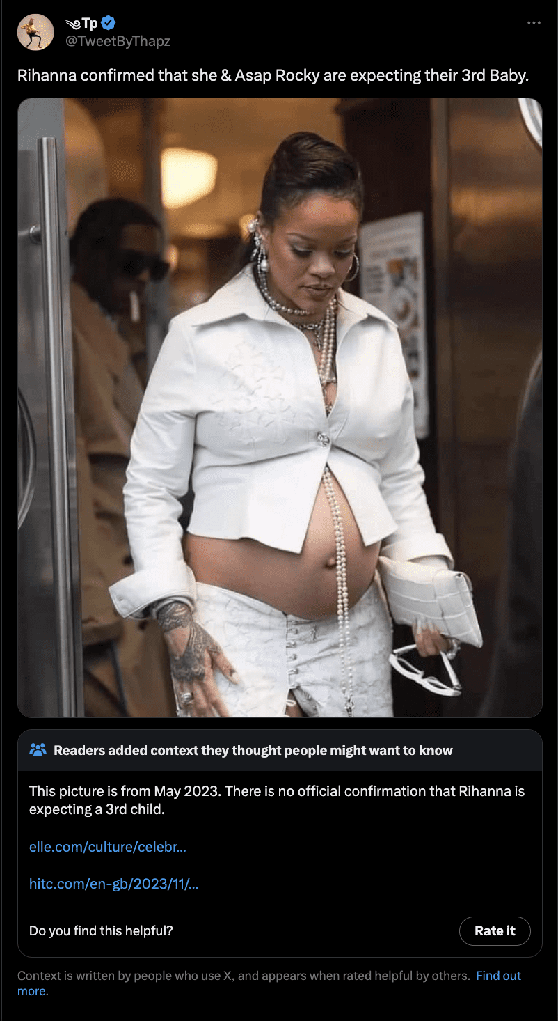 Rihanna and Meghan Markle found themselves at the center of fake baby news this year, resulting in them claiming the 5th and 6th spots on our index, respectively. A deepfake video falsely showing Rihanna pregnant with her third child caused quite a stir. Despite giving birth to her second child with A$AP Rocky in August 2023, a subsequent rumor about her expecting another baby soon after quickly spread during Veterans Day weekend, but it was completely untrue.