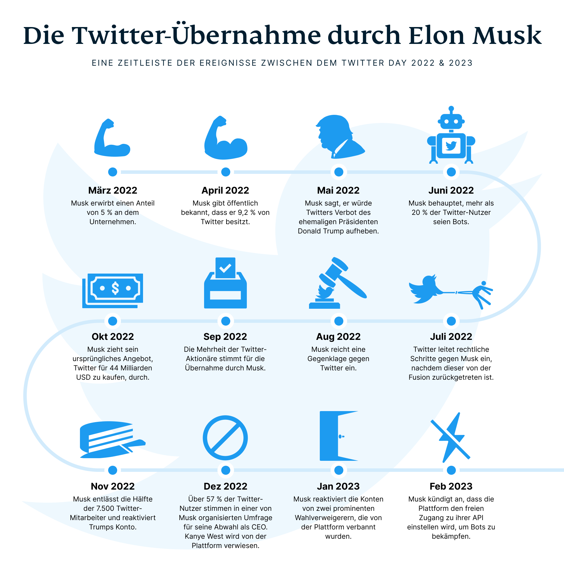 - 13. Februar 2023: Musk kündigt an, dass er die blauen Twitter-Häkchen von Personen entfernen wird, die nicht dafür bezahlt haben, einschließlich älterer Konten.