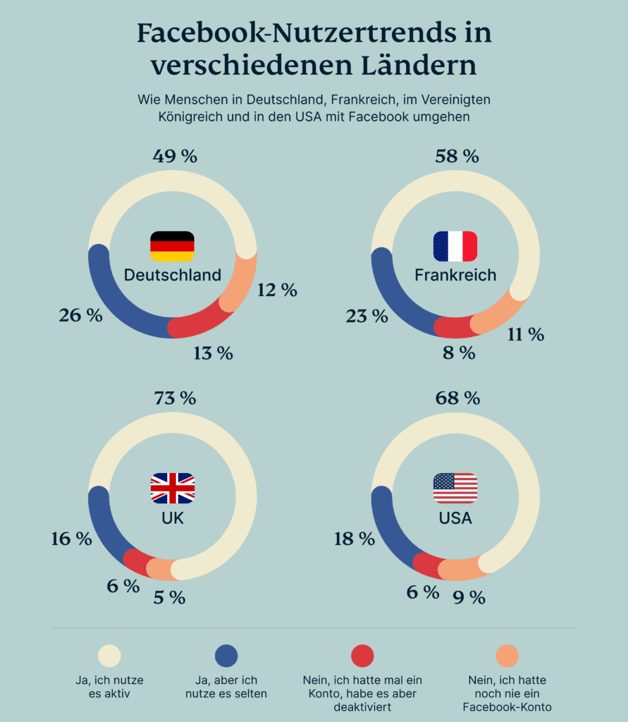 Facebook ist zwar noch immer ein globaler Riese, doch ein genauerer Blick zeigt deutliche Unterschiede. Im Vereinigten Königreich geben 73 % der Befragten an, Facebook aktiv zu nutzen. Die USA folgen mit 68 %. In Frankreich und Deutschland hingegen liegt die Zahl bei 58 % bzw. 49 %. Dennoch schränken viele Nutzer ihre Aktivität zunehmend ein: 26 % der Deutschen und 23 % der Franzosen geben an, Facebook nur noch selten zu nutzen.