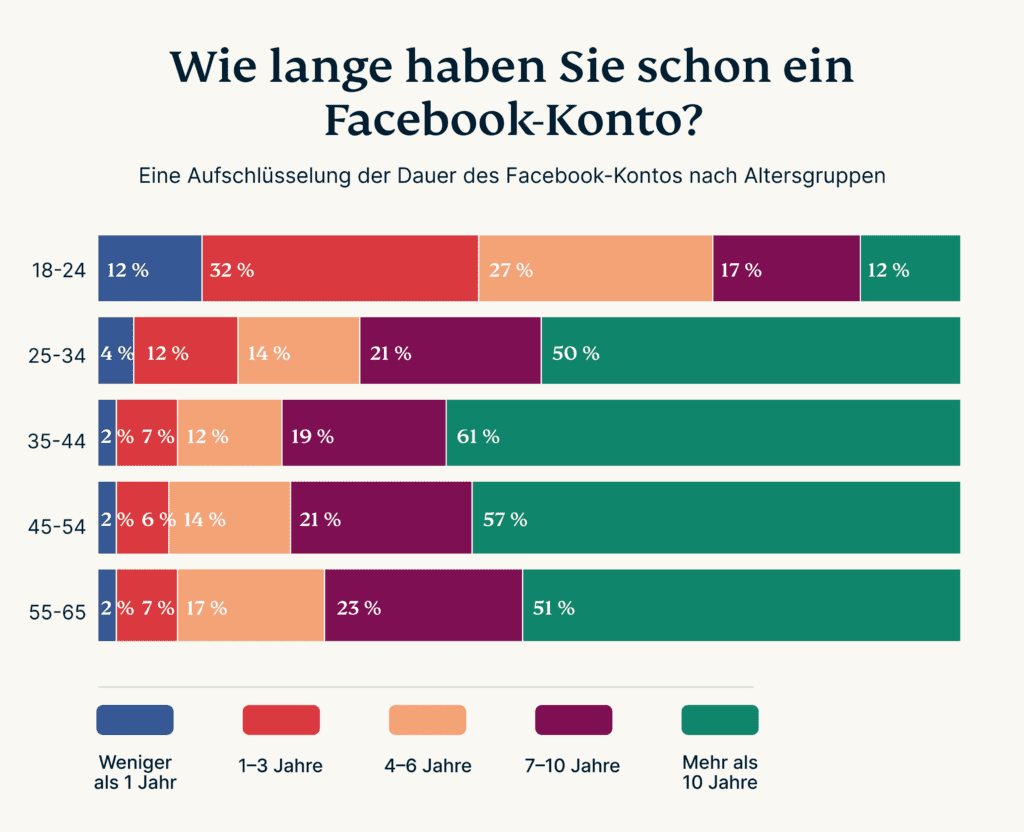 Die 35- bis 44-Jährigen sind die loyalsten Facebook-Nutzer: 72 % sind weiterhin aktiv, 61 % nutzen die Plattform seit mehr als zehn Jahren.