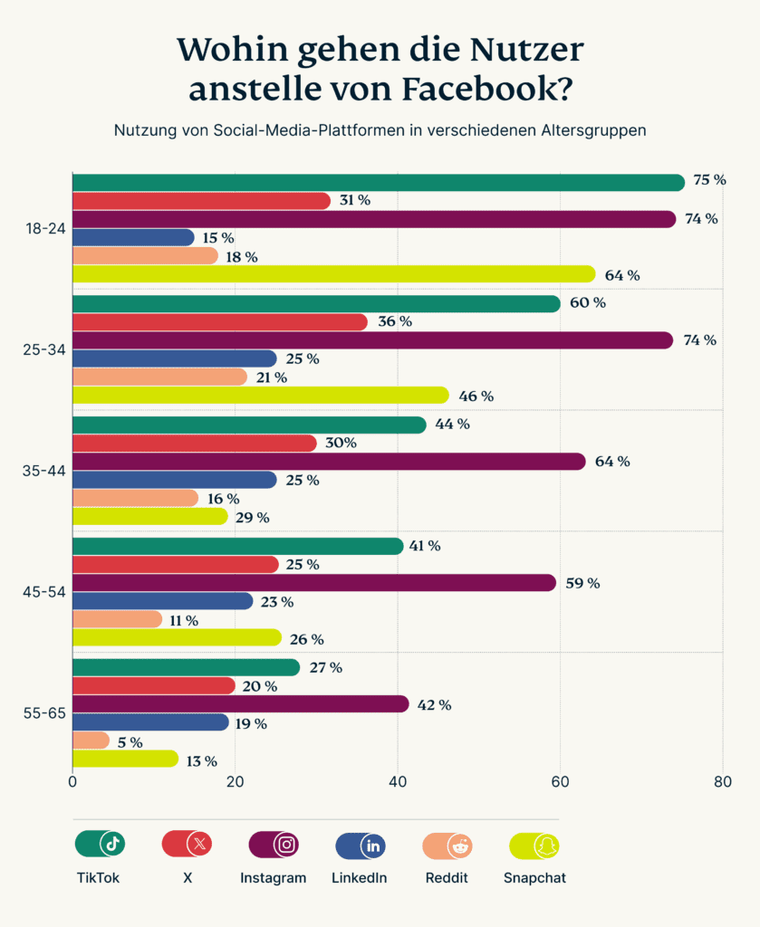 Für Gen Z (18–24) stehen Plattformen wie TikTok und Instagram im Mittelpunkt. TikTok führt mit 75 % der Gen-Z-Nutzer, während 74 % auf Instagram aktiv sind. Auch Snapchat bleibt beliebt – 64 % dieser Altersgruppe nutzen es für schnelle, ungezwungene Interaktionen.