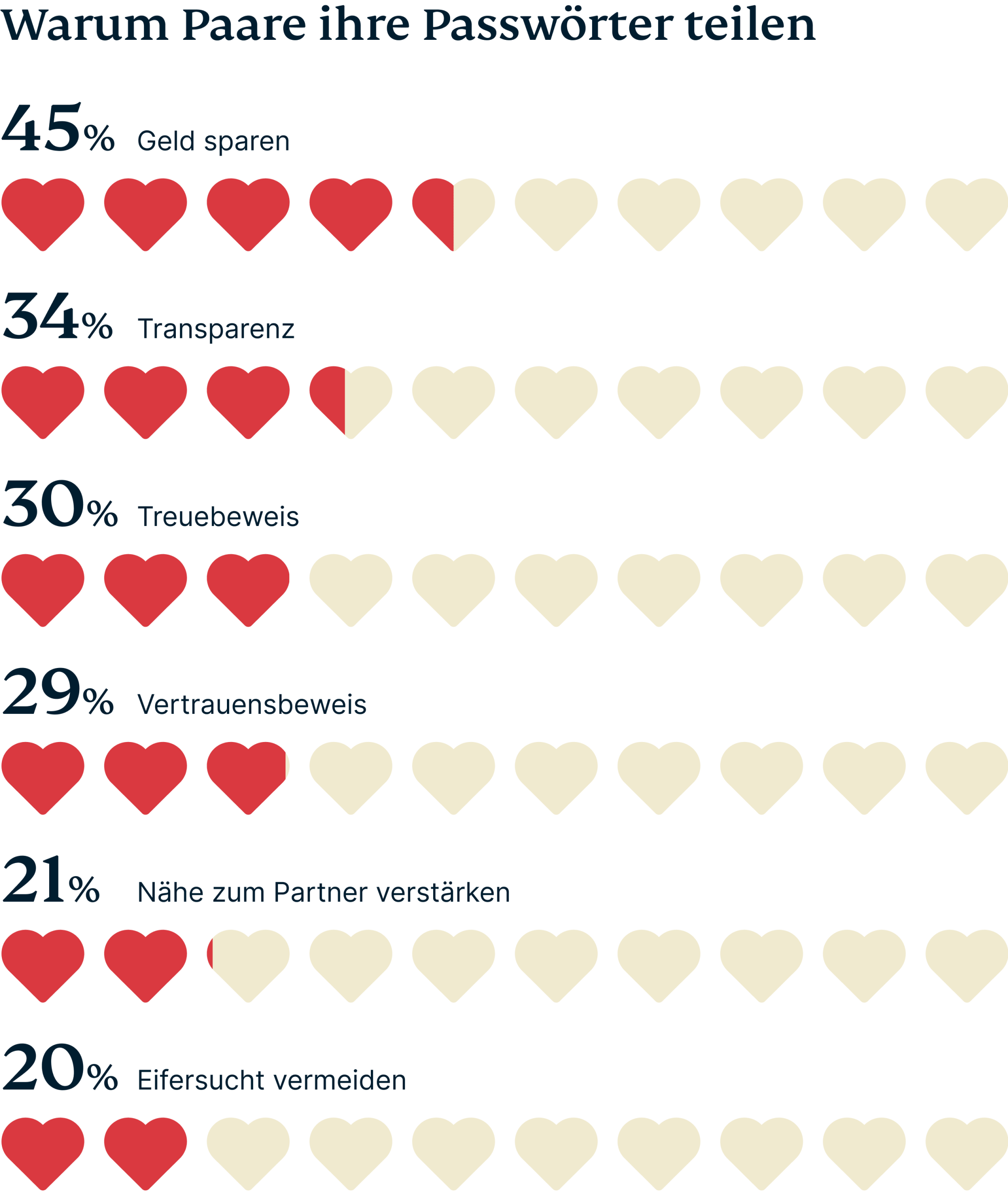 Die Gründe dafür sind unterschiedlich, aber der häufigste Grund ist pragmatisch – Geldersparnisse. Andere Gründe haben mit der Verbesserung der Beziehung zu tun, z. B. um Transparenz oder Vertrauen zu zeigen. Am besorgniserregendsten ist vielleicht, dass jeder Fünfte sogar Passwörter geteilt hat, um Eifersucht zu vermeiden.