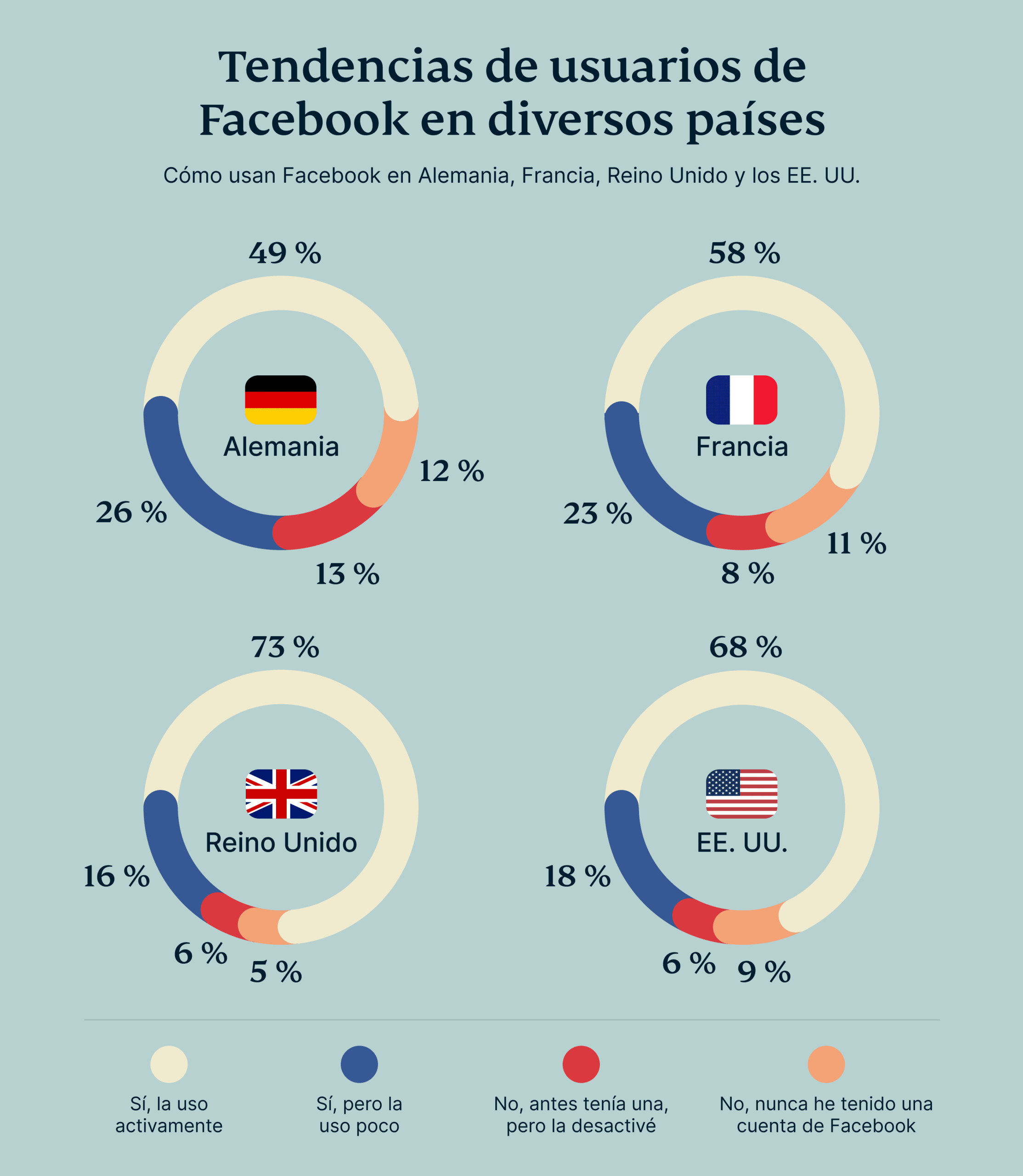 Facebook sigue siendo un gigante global, pero un análisis más detallado revela diferencias significativas. En el Reino Unido, el 73% de los encuestados afirma que usa la plataforma activamente. EE. UU. le sigue de cerca con un 68% de usuarios que inician sesión con regularidad. Francia y Alemania, sin embargo, están rezagados con un 58% y 49%, respectivamente. Aun así, incluso en estas regiones, muchos usuarios están reduciendo su actividad. Un notable 26% de los alemanes y un 23% de los franceses admiten que rara vez interactúan con sus cuentas.