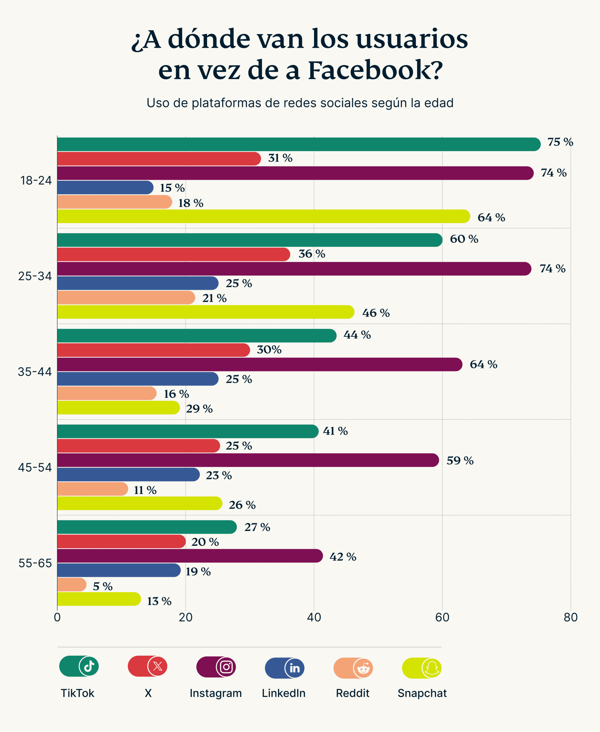 Para la Generación Z (18-24), plataformas como TikTok e Instagram se han convertido en las principales opciones. TikTok lidera con un 75% de usuarios de esta generación, mientras que Instagram le sigue de cerca con un 74%. Snapchat también sigue siendo popular, con un 64% de este grupo utilizándolo para interacciones rápidas y casuales.