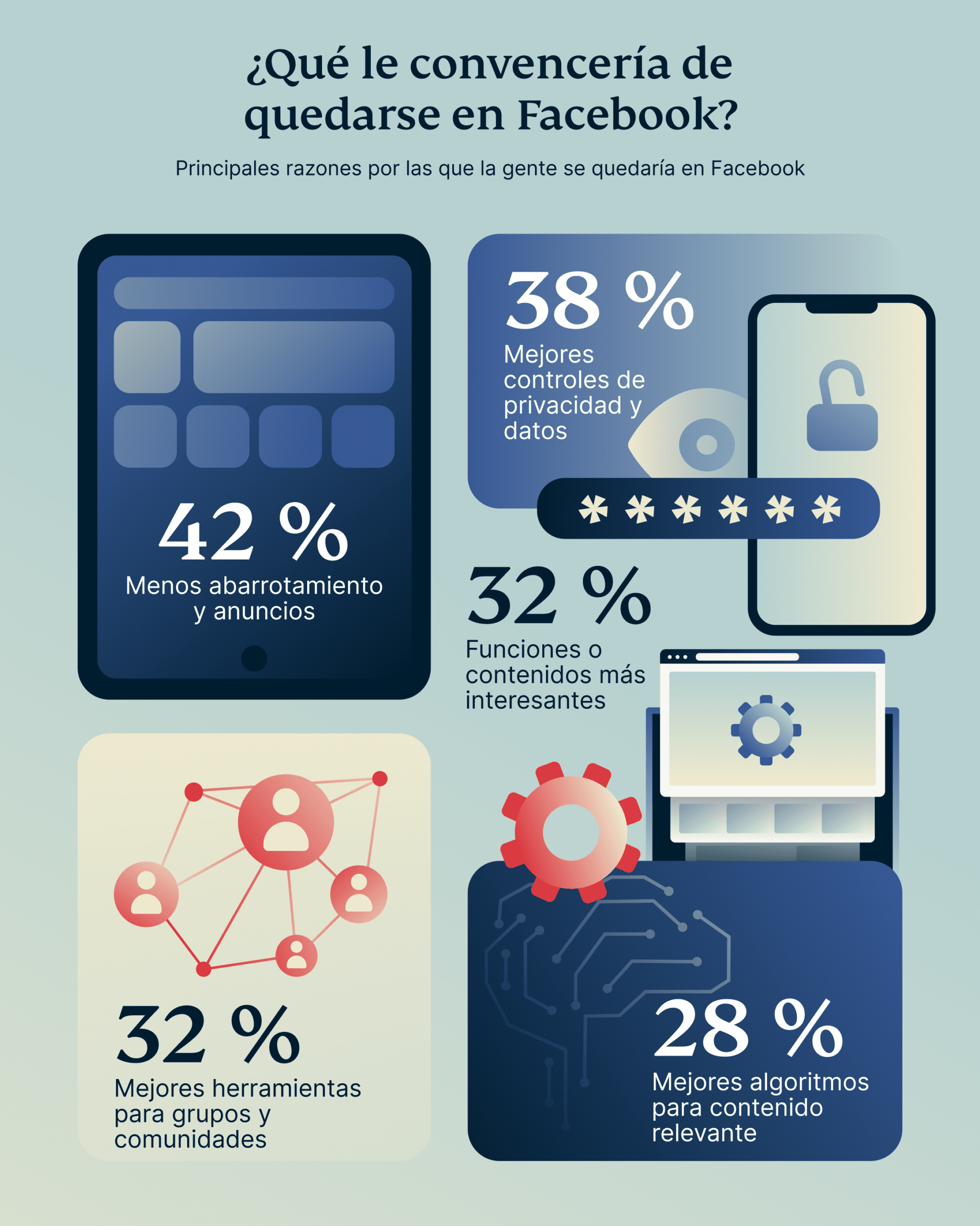 La buena noticia para Facebook es que la reinvención no es inalcanzable. Casi un 35% de los usuarios cree que la plataforma puede adaptarse a las nuevas tendencias. Y la historia ha demostrado que Facebook prospera cuando se enfoca en sus fortalezas: fomentar la conexión y crear herramientas que se vuelvan indispensables.