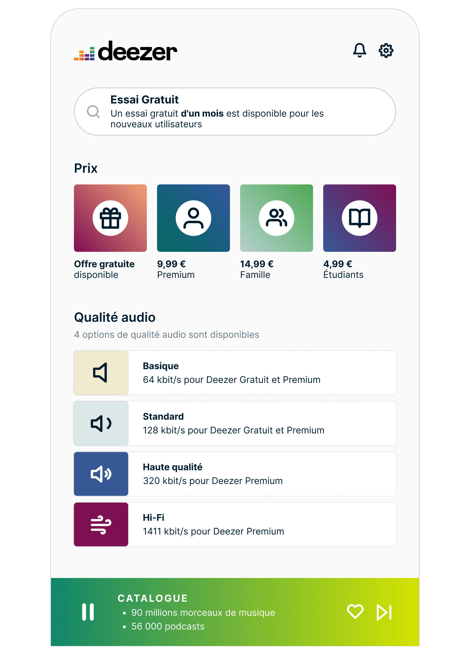 Grâce à Spotify, vous pouvez écouter de la musique et des podcasts à la demande, créer vos propres listes de lecture et partager vos contenus préférés avec vos amis. Spotify propose une version gratuite avec des publicités et des offres premium qui permettent d'écouter de la musique sans publicité ou hors ligne, et bien d'autres options audio. L'application est disponible sur tous les appareils populaires, y compris les ordinateurs, les smartphones et les enceintes connectées. Si vous hésitez encore à souscrire un abonnement Spotify Premium, vous pouvez bénéficier d'une période d'essai gratuite d'un mois (réservée aux nouveaux utilisateurs) pour tester le service avant de vous abonner.