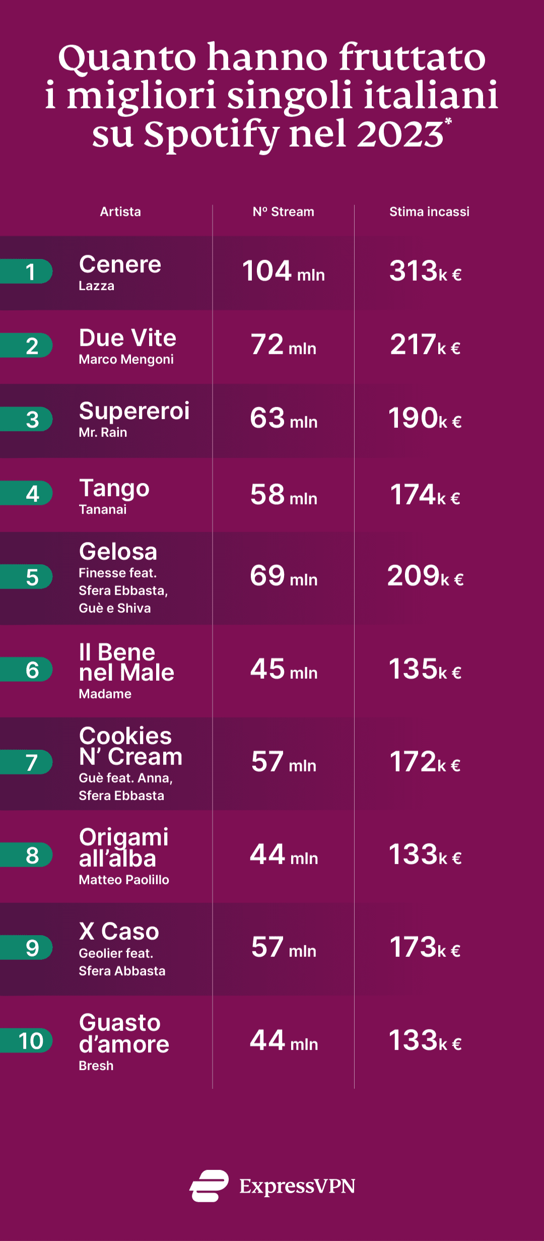Fatte dunque tutte le premesse e analizzato nel dettaglio la divisione delle quote che le varie piattaforme streaming riescono a garantire ai vari cantanti, ci siamo divertiti a disegnare la classifica delle canzoni “più ricche” dei primi sei mesi del 2023 - con riferimento ai soli singoli italiani e ricordando sempre che, quelle cifre, poi vanno divise e frazionate ulteriormente per tutta la “catena” di persone che ha lavorato alla realizzazione della singola canzone.