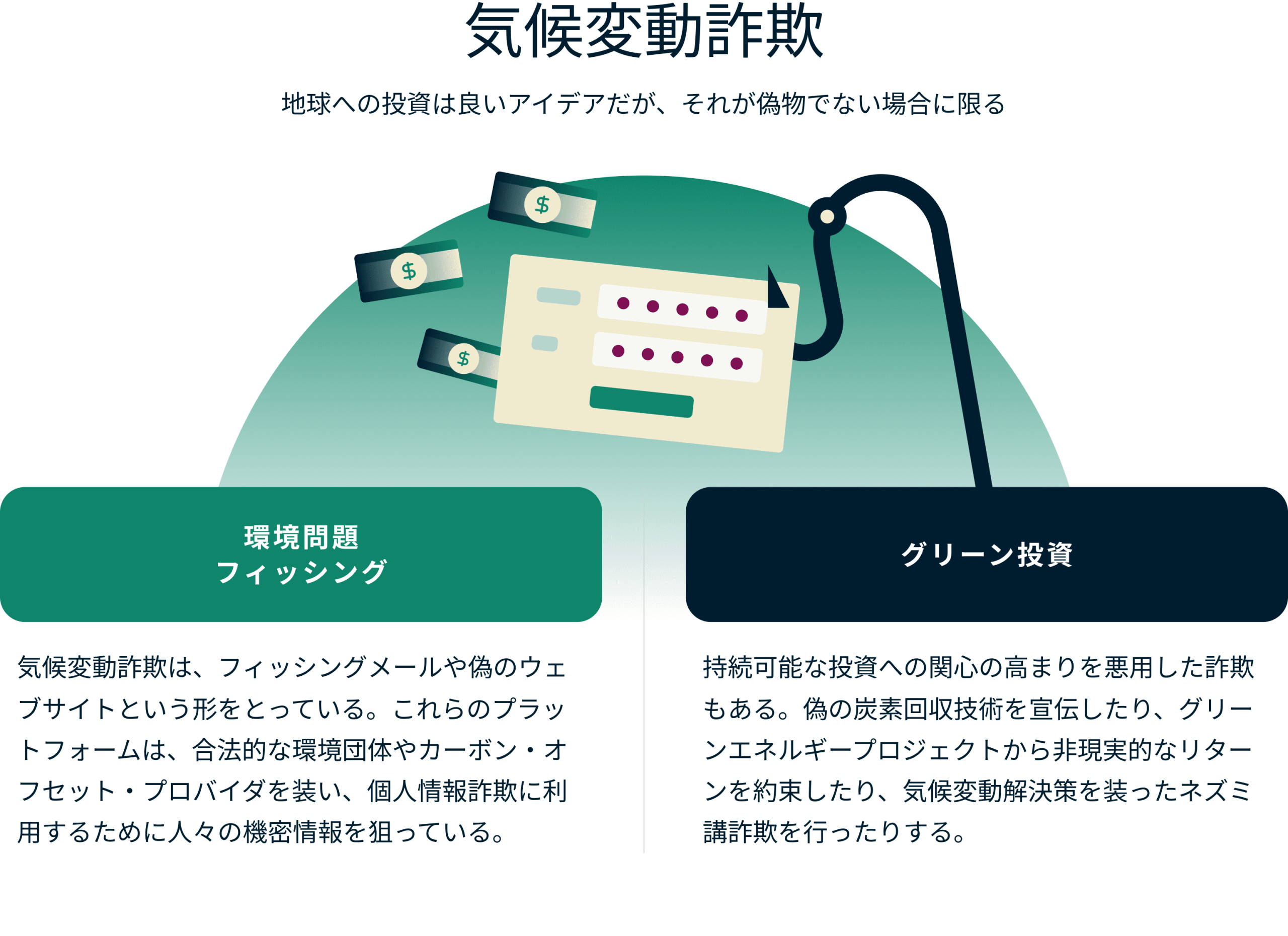 • グリーン投資詐欺に注意する:未検証の技術や、非現実的なリターンを約束するグリーンエネルギープロジェクトへの投資は避けましょう。気候変動関連のソリューションに投資する前に、徹底的なデュー・デリジェンスを実施し、規制当局の承認を確認し、関連するリスクを理解しましょう。