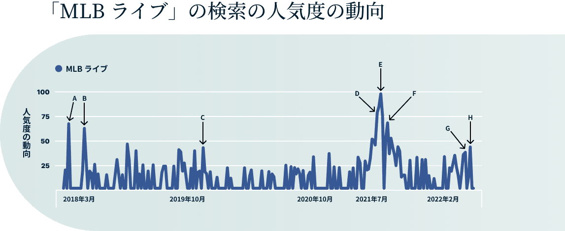 大谷翔平選手が米国メジャーリーグ(大リーグ)のエンゼルスに入団したのが2018年の春。その後、ア・リーグMVPに選出され大活躍した2021年を経て、「MLB ライブ」への関心が急激に高まったことがわかります。