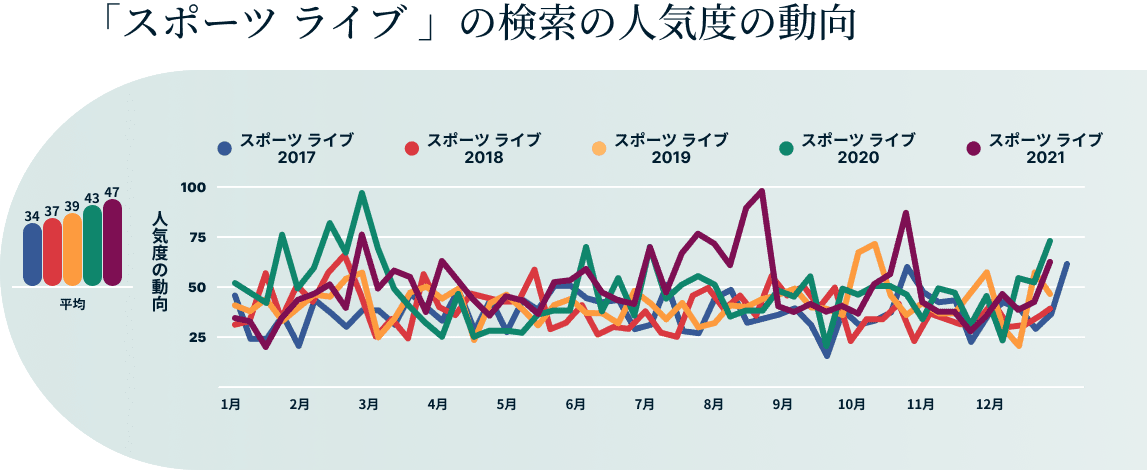 「スポーツ ライブ」の検索は、棒グラフの平均が示す通り2017から2021にかけて増加傾向にあります。グラフが大きく伸びている点をいくつか考察してみましょう。