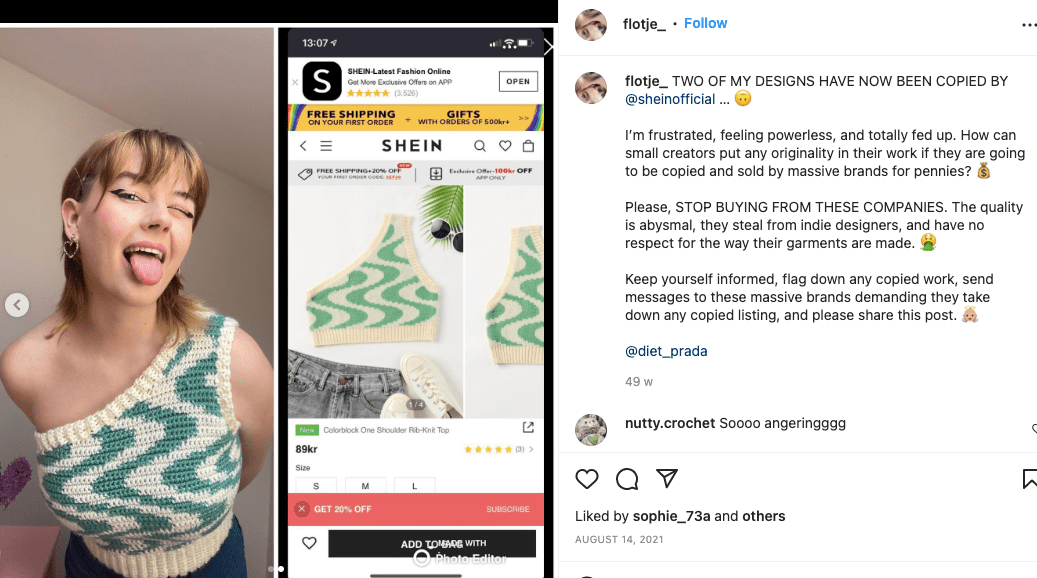 Sheinは、独立系アーティストや小規模ビジネスのデザインをコピーしているとの批判も受けています。多くのデザイナーが、Sheinが彼らのオリジナル作品を無断で大量生産して販売したと主張しています。