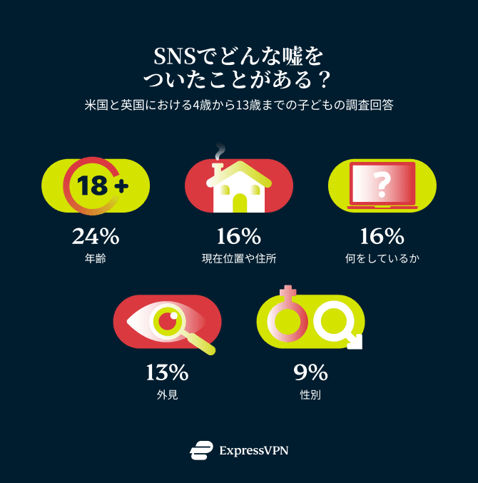子どもが嘘をつく理由についてまでは尋ねていませんが、SNS上で居住地や行動、容姿を偽る子どもがいるということは、ネット上で、見知らぬ人から自分を守る必要を感じていることを示唆しています。また、彼らが社会に適合すること、非現実的な社会基準を満たすこと、または承認を求めることに対するプレッシャー、つまりソーシャルメディアによって増幅されるプレッシャーに対応していることを示唆している可能性もあります。時間が経つにつれて、この行動は彼らの自尊心と精神的健康に潜在的に害を及ぼす可能性があります。