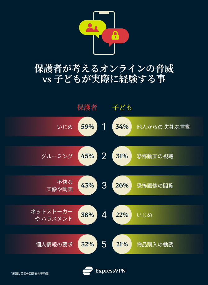 親の懸念している通り、22%の子どもがオンラインでいじめられたことを認めています。 さらに、調査対象の子どもの17%が知らない人から学校名を聞かれたことがあり、14%が自宅の住所を聞かれたことがあると回答しています。