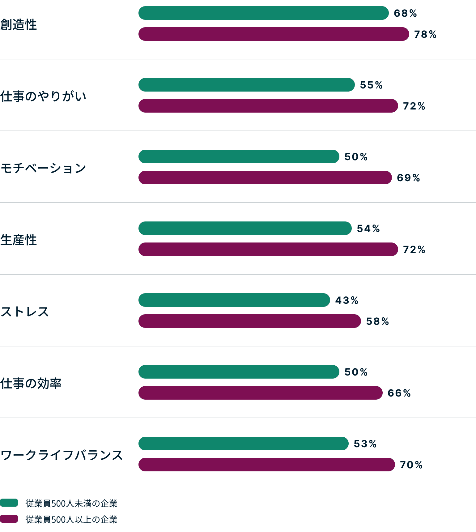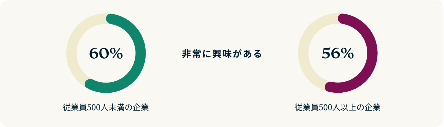 従業員500人以上の企業の雇用主は、500人未満の企業と比較して、没入型の仕事環境に最も関心を持っています。一方、大企業の従業員は、「メタバースで働くことに興味がある」と答えた人が最も少ないです。