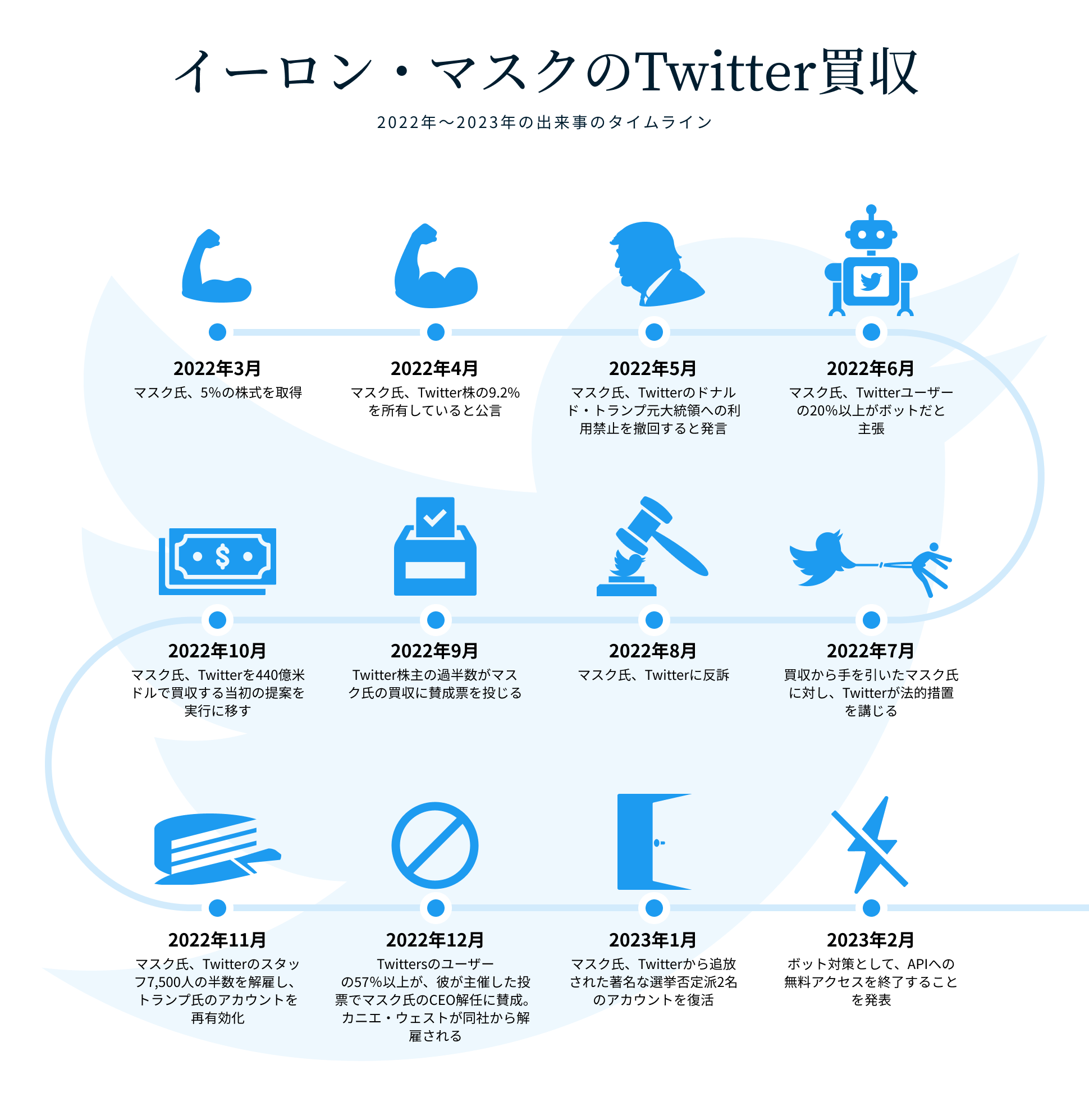 エンバーグ氏が懸念しているのは、マスク氏がTwitterの買収計画を公にして以来、Twitterをめぐる論争が後を立たないことです。主な出来事を以下に時系列でまとめました。