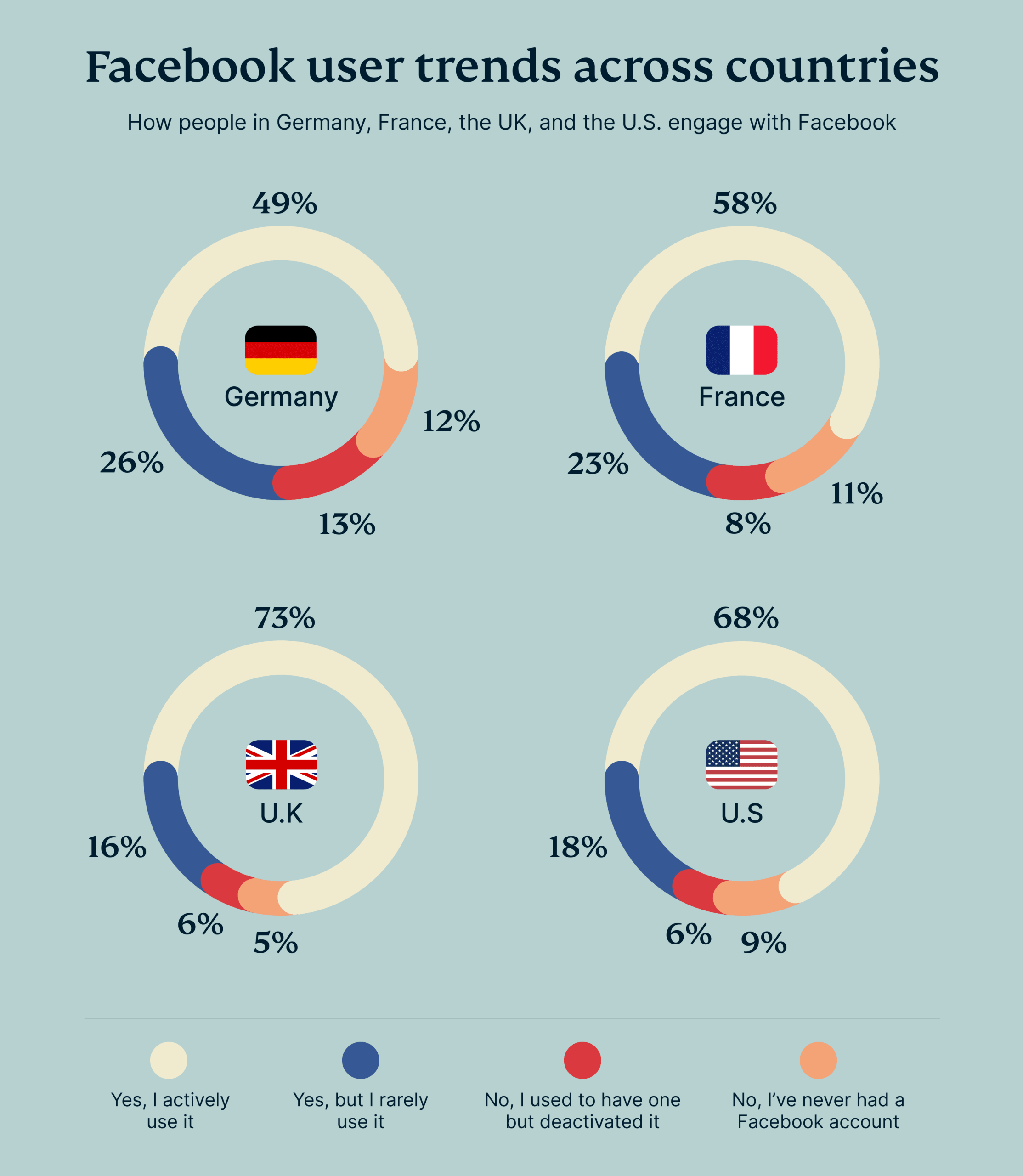 페이스북은 여전히 글로벌 거대 플랫폼이지만, 세부적으로 들여다보면 흥미로운 차이가 보입니다. 영국에서는 응답자의 73%가 페이스북을 적극적으로 사용한다고 답했으며, 미국도 68%로 뒤를 이었습니다. 그러나 프랑스(58%)와 독일(49%)은 상대적으로 저조한 사용률을 보였습니다. 더욱이, 이들 국가에서도 점점 더 많은 사용자가 페이스북 이용을 줄이고 있습니다. 독일에서는 26%, 프랑스에서는 23%의 사용자가 계정을 가지고 있지만 거의 활동하지 않는다고 응답했습니다.