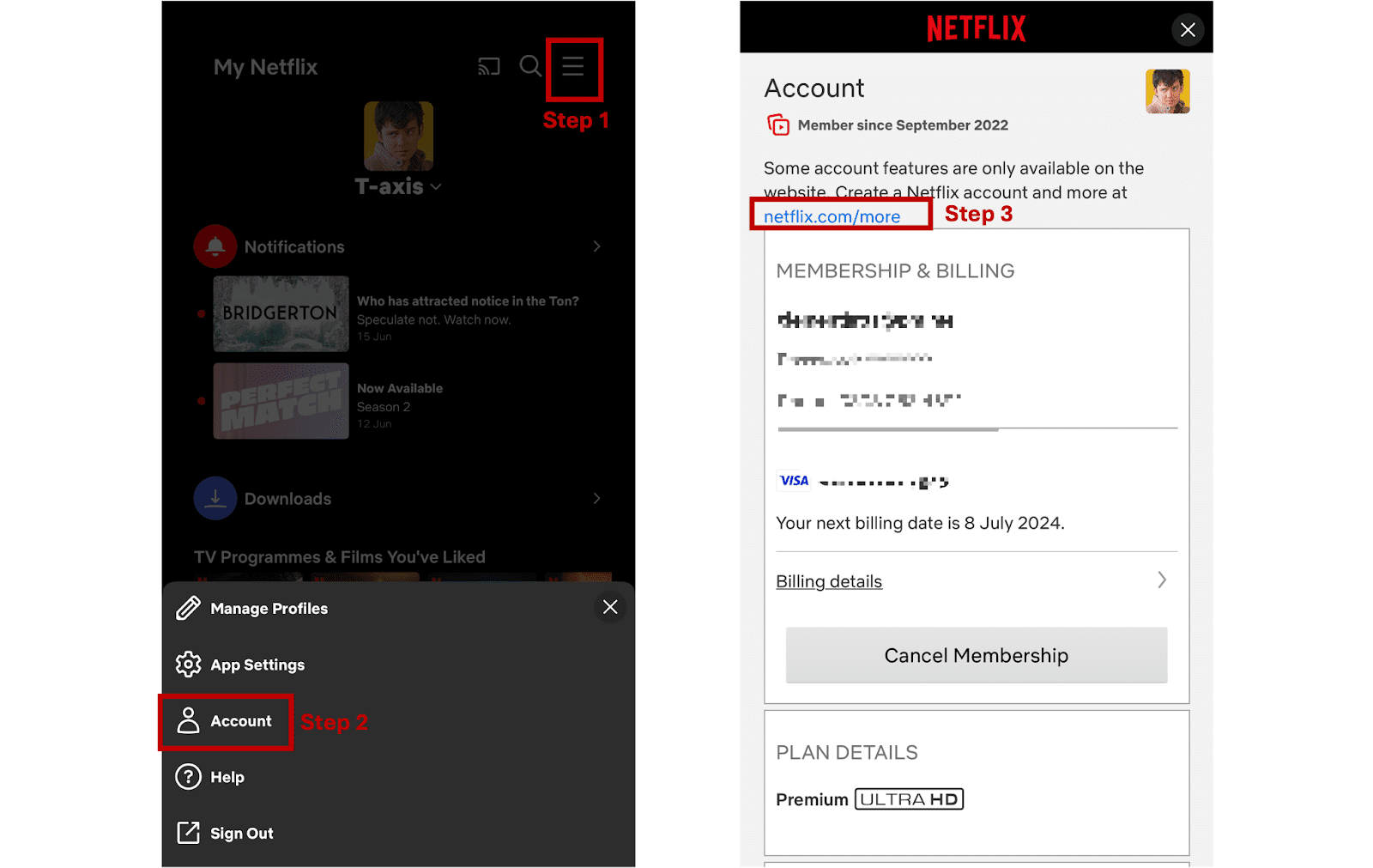 1. Meld je aan bij je account en tik op het menupictogram in de rechterbovenhoek. Selecteer Account.