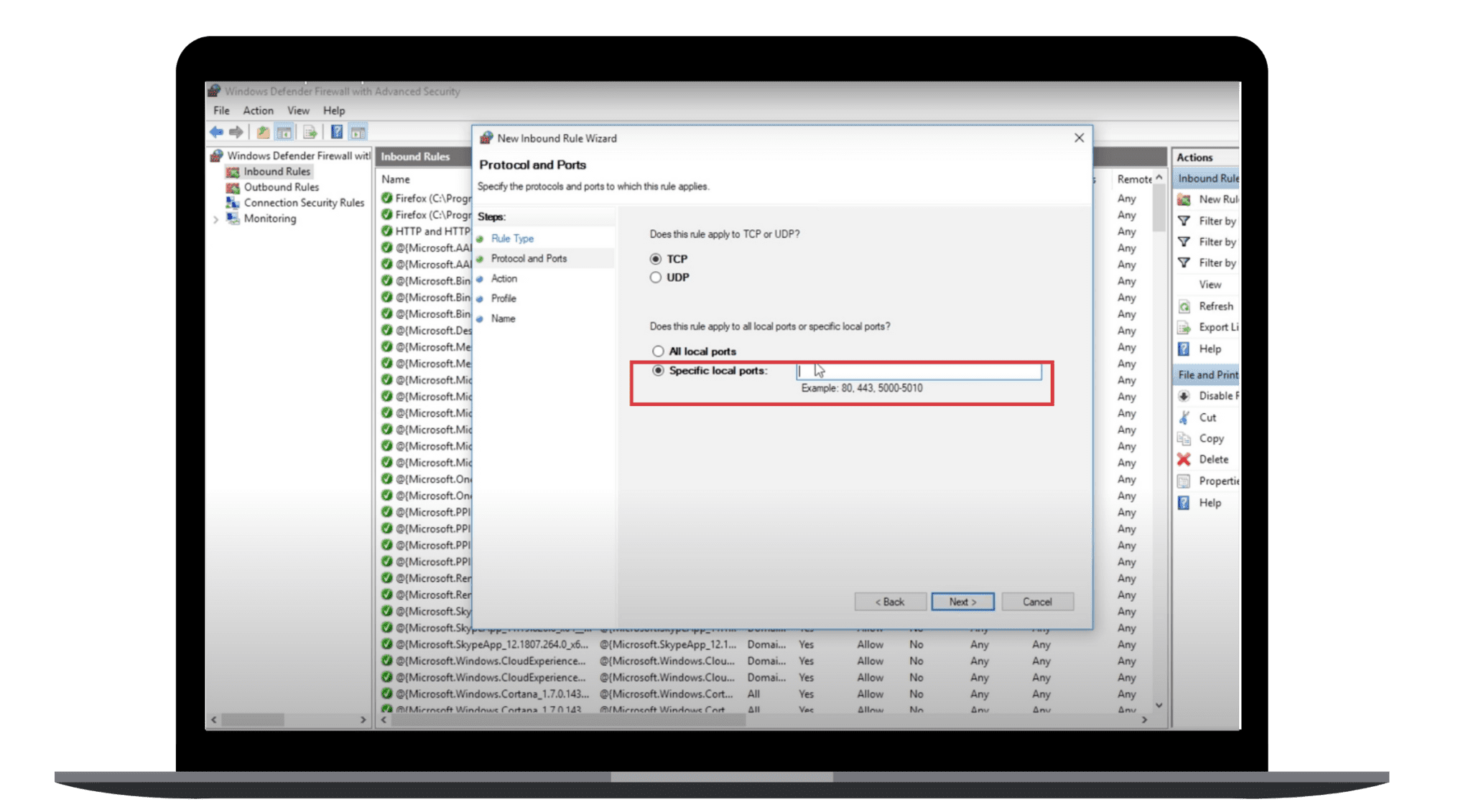 5. Selecteer TCP en Specifieke lokale poorten. Typ 443 in het vak Specifieke lokale poorten en klik op Volgende.