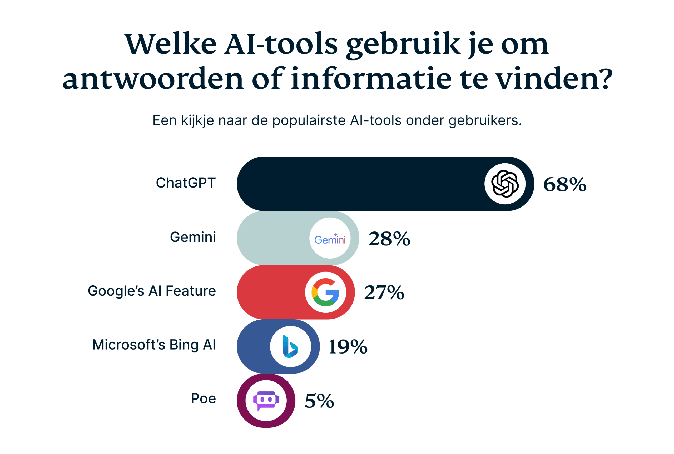 Als het gaat om AI-tools, is ChatGPT de duidelijke favoriet. Bijna 7 op de 10 gebruikers (68%) noemen het hun voorkeurskeuze voor het beantwoorden van vragen, terwijl concurrenten zoals Gemini (28%) en Bard (27%) achterblijven. Het conversatiegerichte formaat en het vermogen om diepgaande antwoorden te geven, hebben ChatGPT tot een opvallend hulpmiddel gemaakt, vooral voor jongere gebruikers die op zoek zijn naar gepersonaliseerde en boeiende antwoorden.