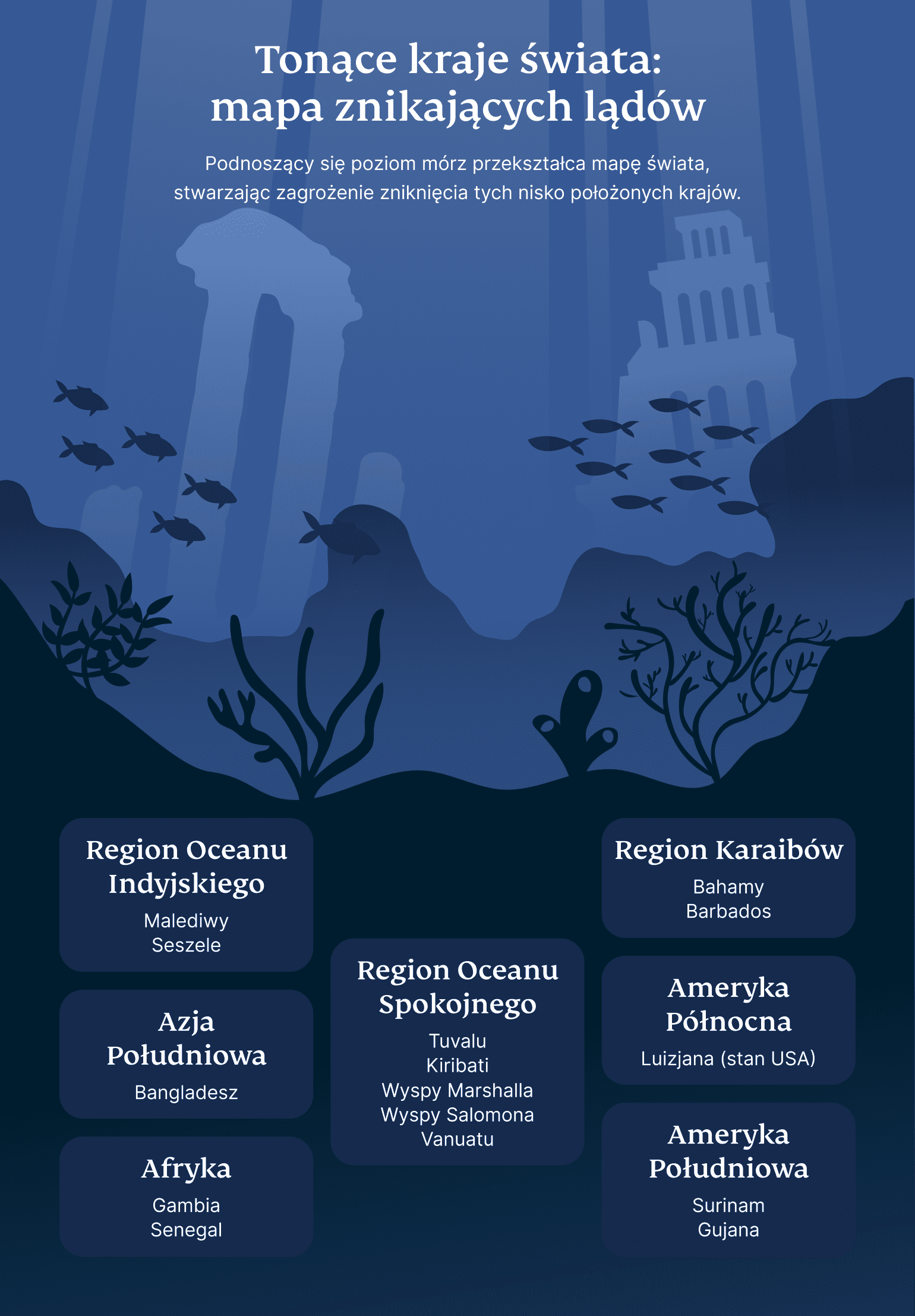 Dla wielu regionów przybrzeżnych i wyspiarskich ocean zawsze był źródłem napędzającym gospodarkę, kształtującym kulturę i łączącym społeczności. Ale teraz stwarza zagrożenie, że wszystko to zostanie odebrane. Wśród najbardziej zagrożonych krajów znajdują się Tuvalu, Malediwy i Kiribati. Nie są to jednak jedyne takie przypadki. Na całym świecie nisko położone obszary – od atoli na Pacyfiku i Oceanie Indyjskim po części Bangladeszu i Luizjany – stoją w obliczu ryzyka zniknięcia pod falami.