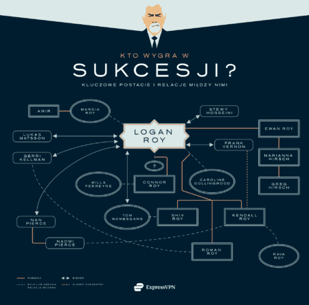 Chcesz dowiedzieć się, co łączy konkretną postać z Loganem Royem? Zanim przejdziemy do rankingu pretendentów do roli nowego prezesa Waystar Royco, przypomnijmy sobie, kto bierze udział w tej spektakularnej walce. Stworzyliśmy diagram, który przedstawia relacje rodzinne i biznesowe bohaterów Sukcesji.