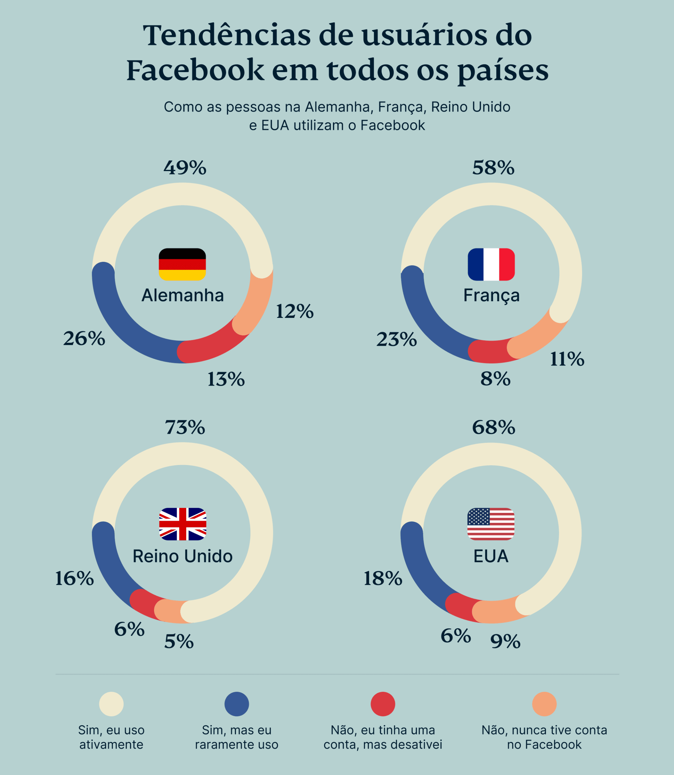 O Facebook ainda é um gigante global, mas uma análise mais detalhada revela diferenças significativas entre os usuários. No Reino Unido, 73% dos entrevistados afirmam que usam a plataforma ativamente. Os EUA vêm logo atrás, com 68% de usuários acessando regularmente. Já na França e na Alemanha, a adesão é menor, com 58% e 49%, respectivamente. No entanto, mesmo nessas regiões, muitos usuários estão reduzindo sua presença. Um número considerável de alemães (26%) e franceses (23%) admitiu que raramente interage com suas contas.