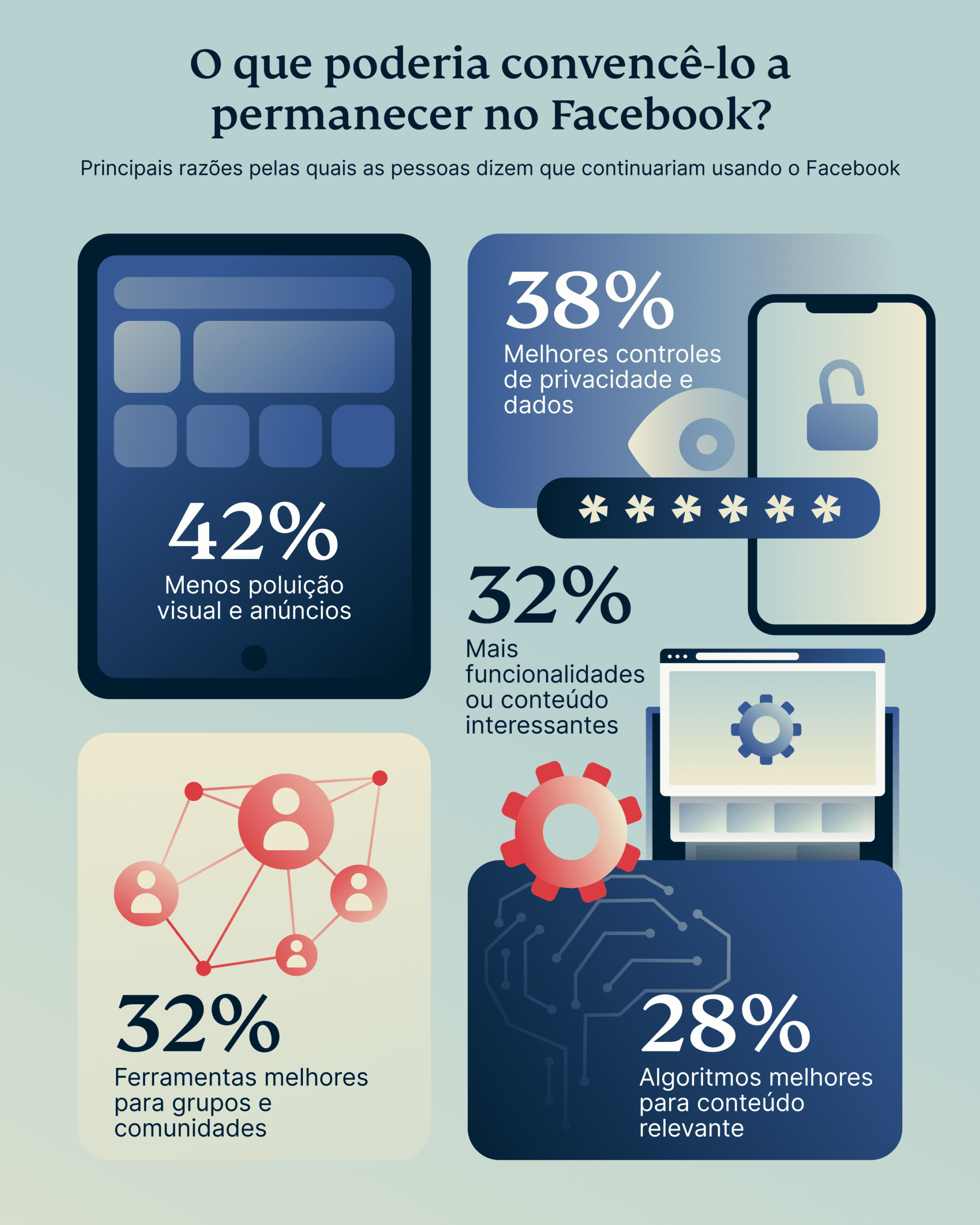 A boa notícia para o Facebook é que a reinvenção não está fora de alcance. Quase 35% dos usuários acreditam que a plataforma pode se adaptar para continuar relevante. E a história mostra que o Facebook prospera quando aposta em seus pontos fortes: conectar pessoas e criar ferramentas que se tornam indispensáveis.