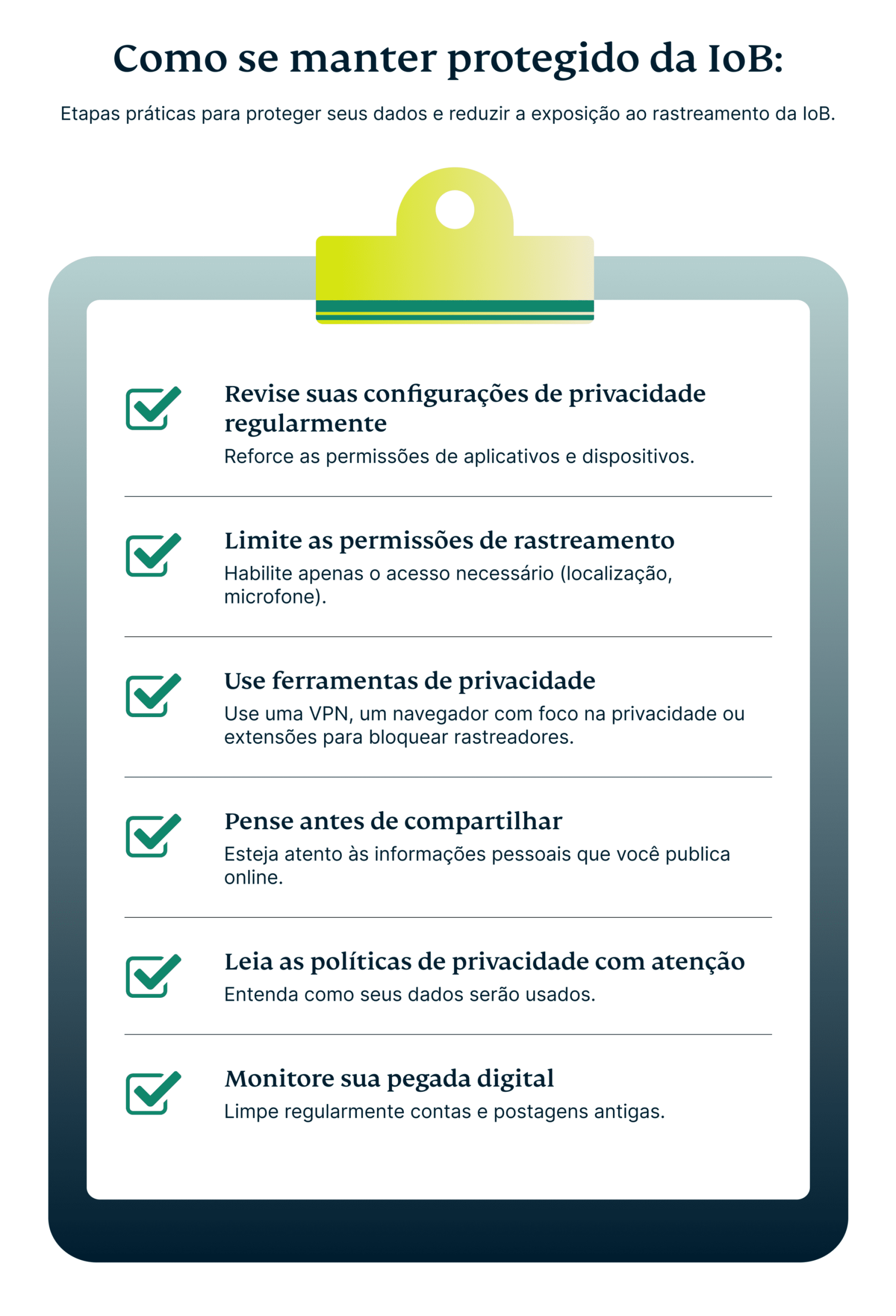 No final das contas, a IoB trata-se de escolhas. Você pode desfrutar de um mundo digital mais personalizado, mas isso significa estar ciente de como seus dados estão sendo usados — e quem está se beneficiando disso. Tome as medidas necessárias para proteger sua privacidade e sempre questione se a conveniência dessas experiências personalizadas vale o que você está abrindo mão.