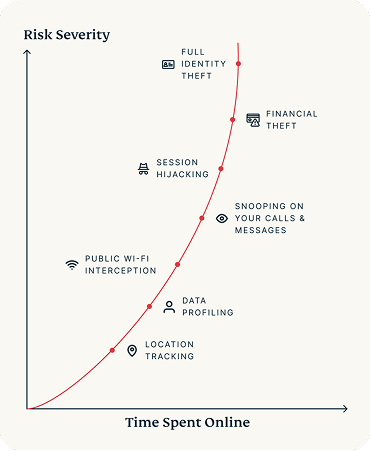 Every connection, scroll, and tap without protection increases your chance of data leaks, ISP snooping, tracking, malvertising, and eventually, identity theft. Most VPNs won’t show you this, but we built this curve to make these threats visible so you can take precautions.